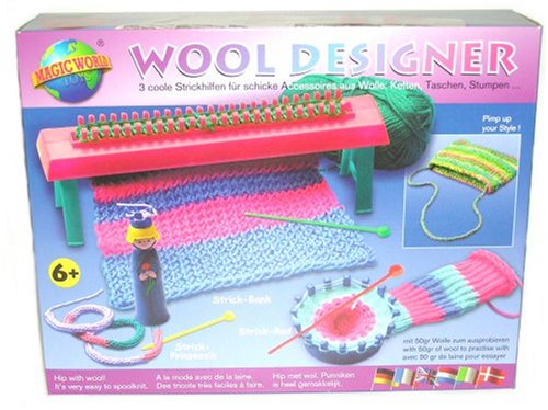 Klassisches Lernset mit Strickbank, Strickrad, Strickliesel, Nadeln und 50g Strickgarn.