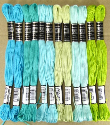 @@@ TÜRKIS-GRÜN-Sortierung @@@ Besonders gut teilbarer Twist von einem europäischen Hersteller. Sie erhalten 12 Döckchen in 6 Farben (wie auf dem Bild) mit jeweils 8 Meter Das Baumwollgarn ist 6-fädig + merzerisiert + farbecht und bis 95° C waschbar !