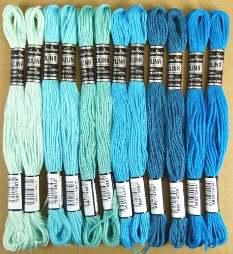 @@@ TÜRKIS-Sortierung @@@ Besonders gut teilbarer Twist von einem europäischen Hersteller. Sie erhalten 12 Döckchen in 6 Farben (wie auf dem Bild) mit jeweils 8 Meter Das Baumwollgarn ist 6-fädig + merzerisiert + farbecht und bis 95° C waschbar !