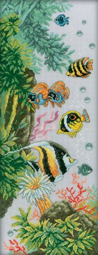 Stickbild "BRIGHT UNDERWATER LIFE" - von RTO Handarbeitspackung, zum Selberfertigen mit Grundstoff Aida 14 (100 % Baumwolle), ohne Rahmen, mit Stickmaterial, Anleitung russisch/englisch, Nadel, Handwäsche, bügeln Stufe 2 . Es handelt sich um ein Qualitätsprodukt aus Russland. Bildgröße: 21x54 cm
